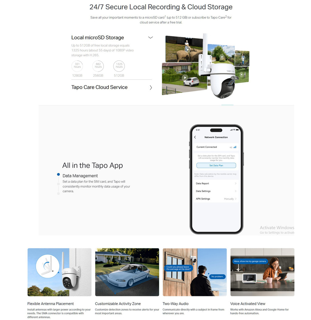 - Local and Cloud Storage: Save all your important moments to a microSD card (up to 512GB) or subscribe to Tapo Care for cloud service.