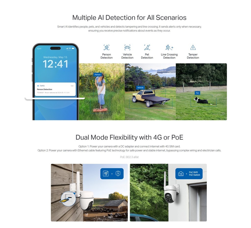 - Free AI Detection: Smart AI identifies people, pets, and vehicles, sending instant notifications through the Tapo app.
