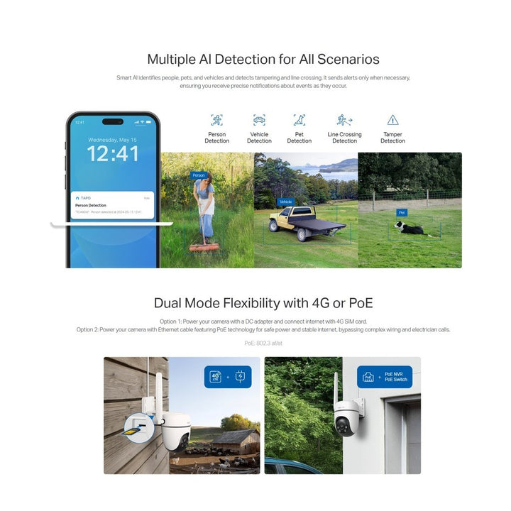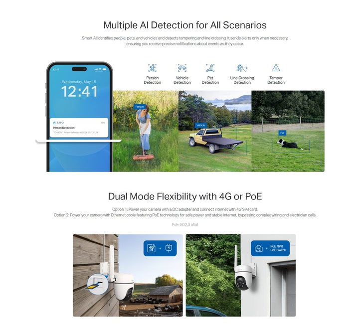 - Dual Mode Flexibility with 4G or PoE: Power your camera with a DC adapter or Ethernet cable featuring PoE technology.