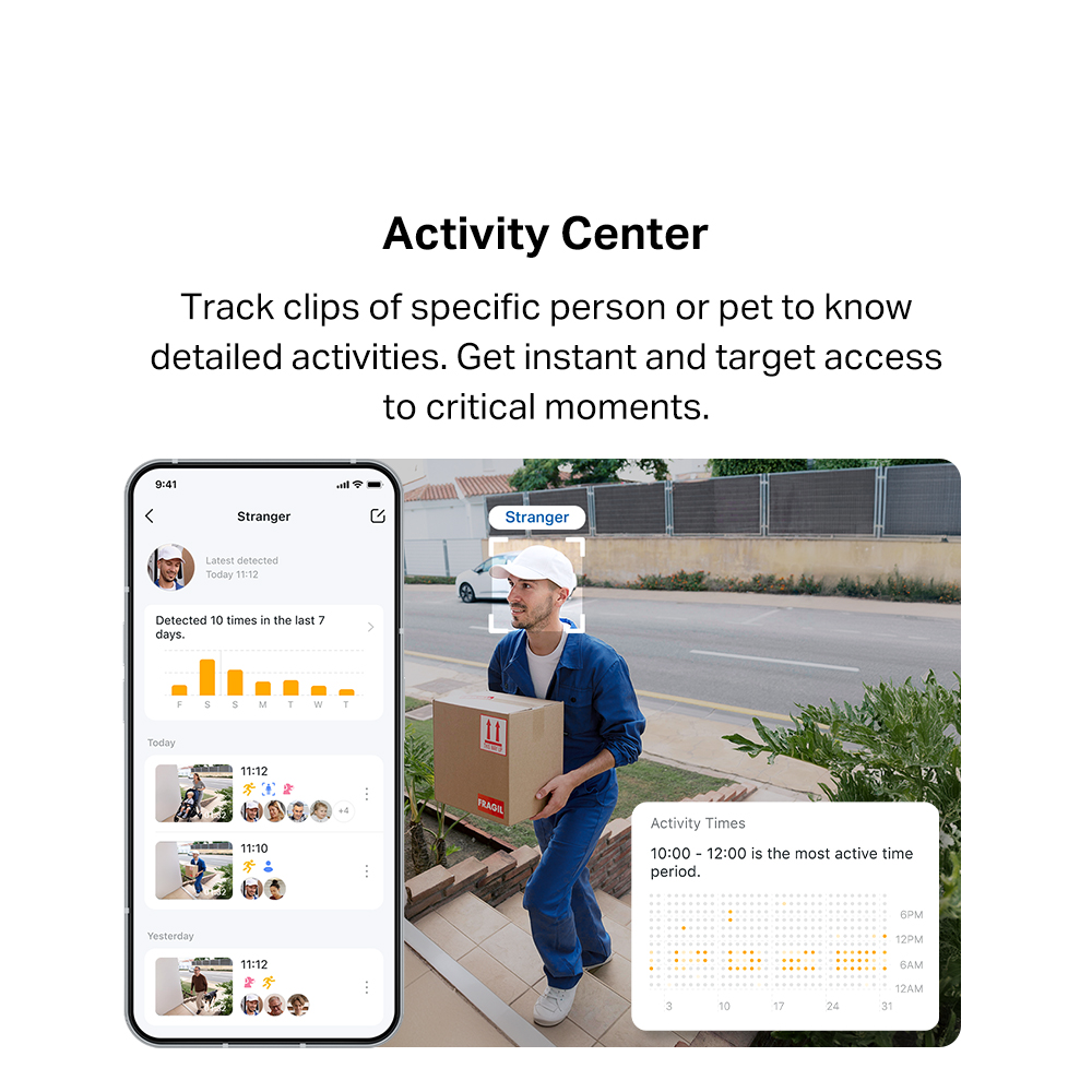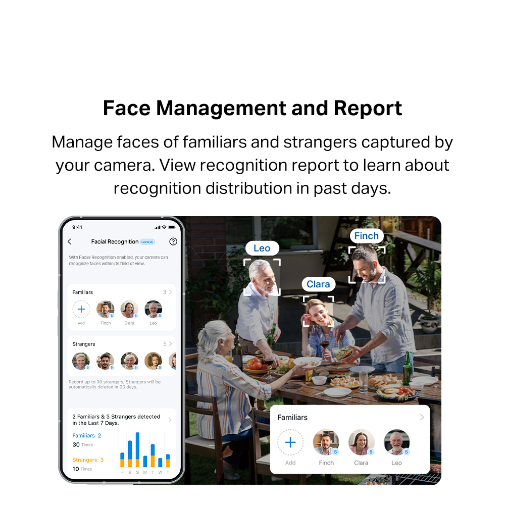 - Local Facial Recognition: The camera boasts free and powerful Al that recognizes and tags strangers, family, and friends for easy identification.