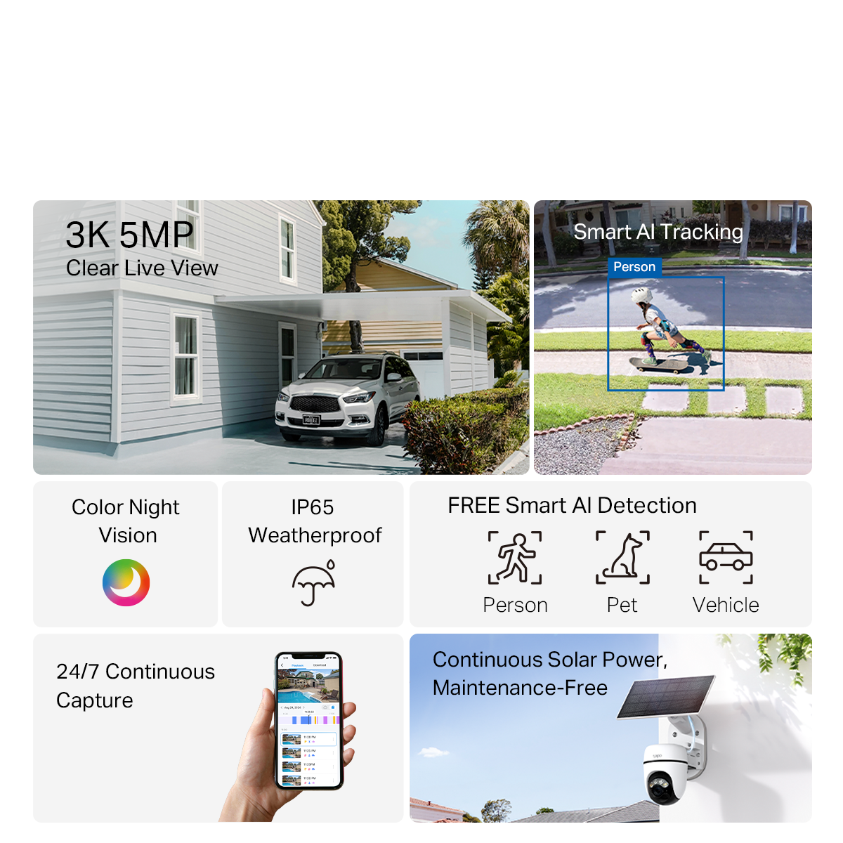 - 360° AI Tracking: The camera provides 360° coverage and accurately identifies and tracks people, pets, and vehicles.