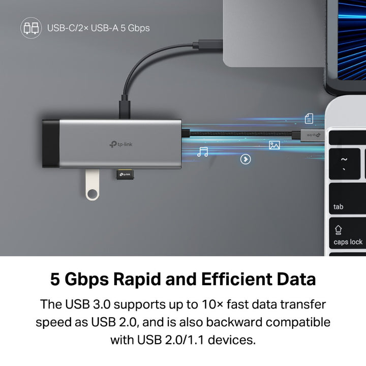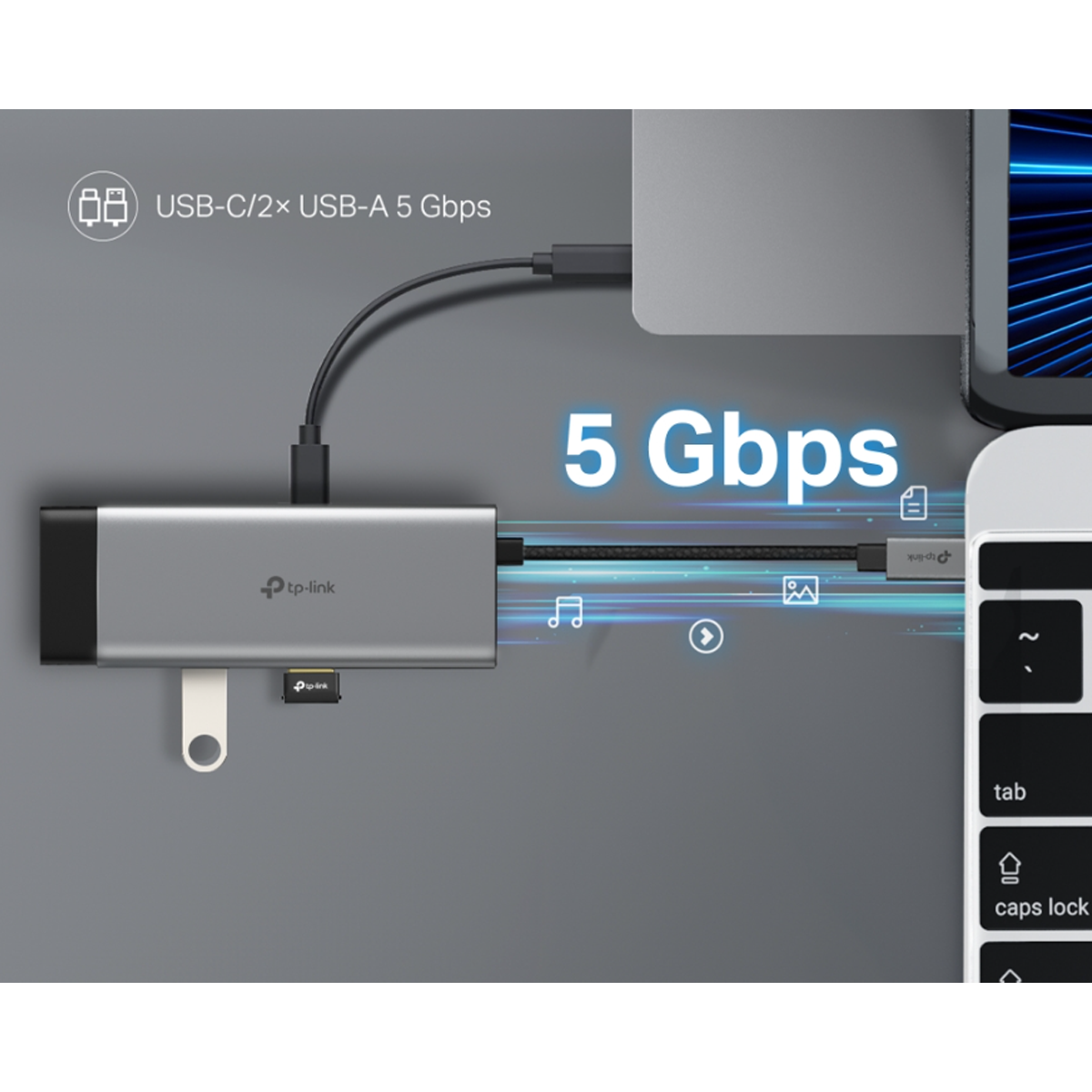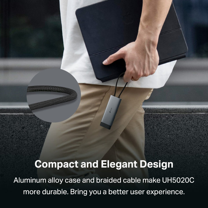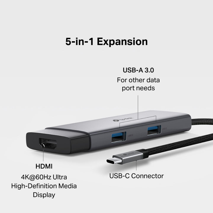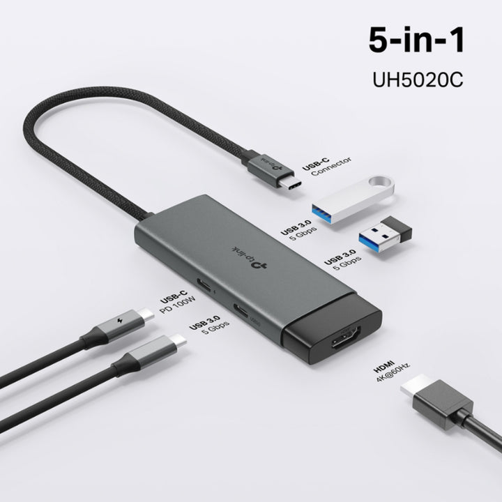 - 5 in 1 USB-C Hub: UH5020C turns a single USB-C port into 5 ports with a 4K@60Hz HDMI, 100W Power Delivery, 1× USB-C Data Port, 2× USB-A Data Ports.