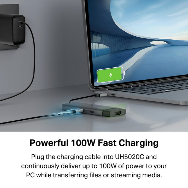 - Powerful 100W Fast Charging: Plug the charging cable into UH5020C and continuously deliver up to 100W of power to your PC while transferring files or streaming media.