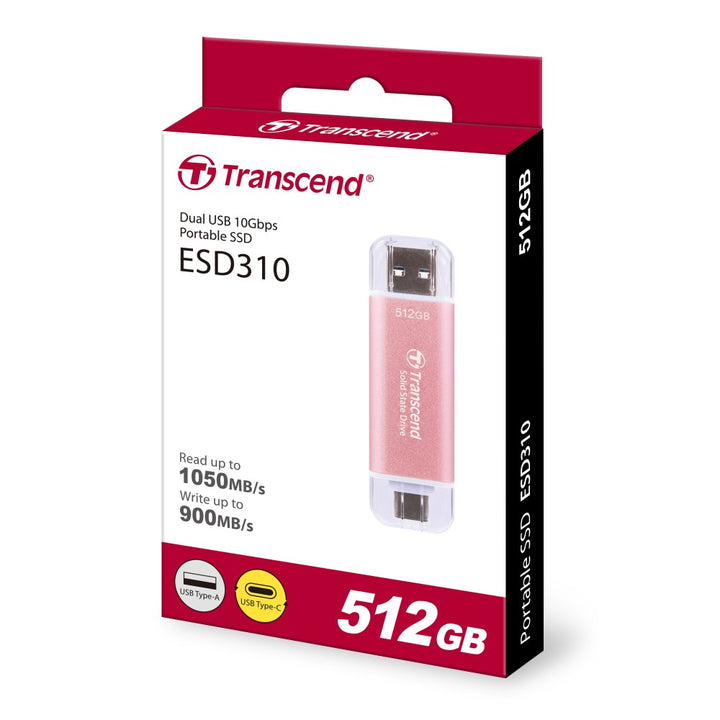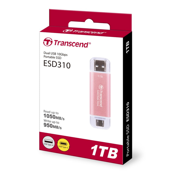 The ESD310C is Transcend's smallest portable SSD that delivers a lightning-fast transfer rate of 10 Gbps and a capacious storage capacity of up to 1TB, allowing you to transfer vast amounts of files in the blink of an eye. With the inclusion of both USB Type-A and Type-C connectors in a single drive, the ESD310C is a convenient and efficient external storage option that you won't want to miss out on!