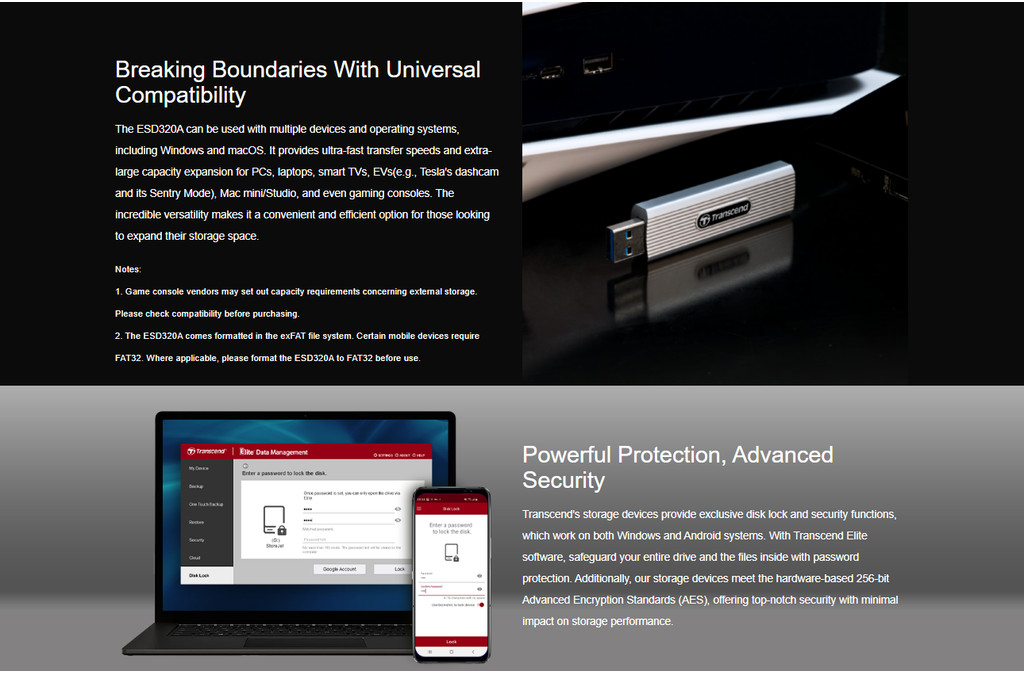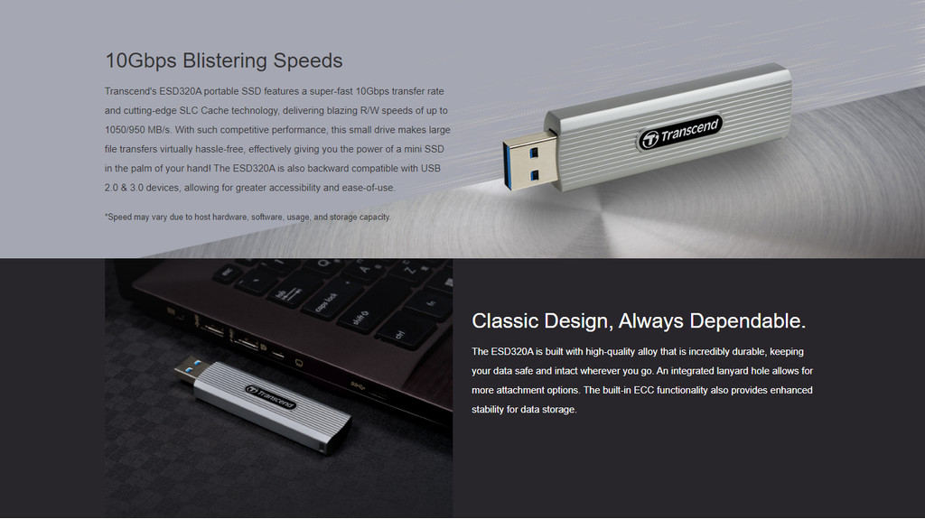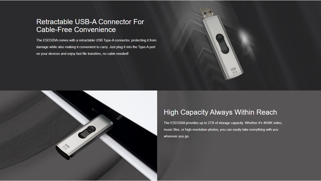 The ESD320A is Transcend's miniature portable SSD that delivers a lightning-fast transfer rate of 10 Gbps and a generous storage capacity of up to 2TB, allowing you to transfer vast amounts of files in the blink of an eye. With a retractable USB Type-A connector, the ESD320A is a convenient and efficient external storage option that you won't want to miss out on!