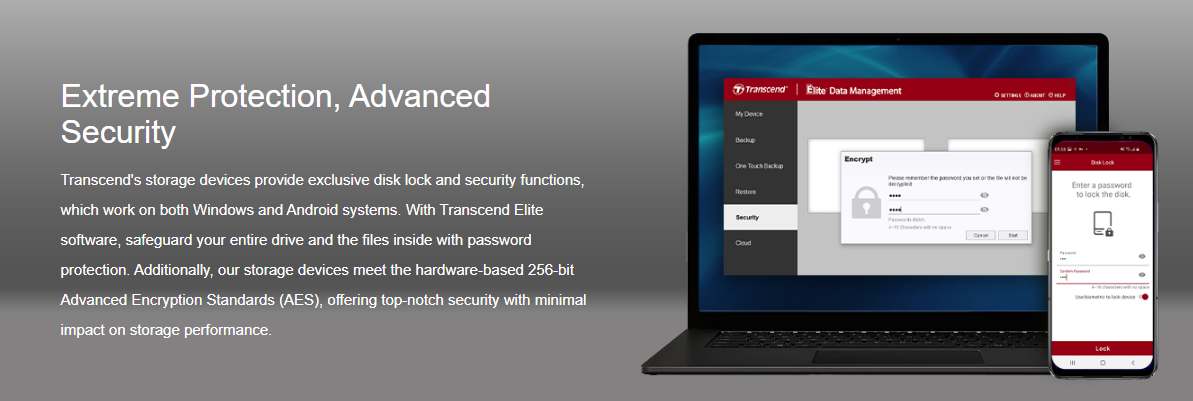 Transcend's storage devices provide exclusive disk lock and security functions, which work on both Windows and Android systems. With Transcend Elite software, safeguard your entire drive and the files inside with password protection. Additionally, our storage devices meet the hardware-based 256-bit Advanced Encryption Standards (AES), offering top-notch security with minimal impact on storage performance.