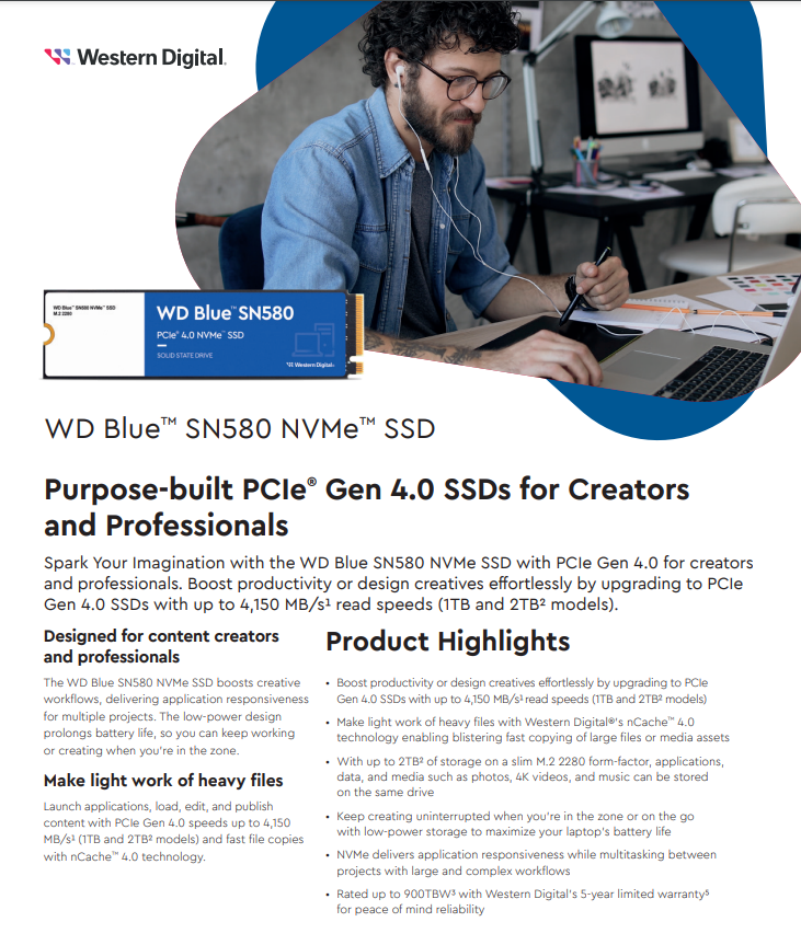 Stay in the moment and create beyond your expectations with the WD Blue SN570 NVMe SSD. This powerful internal drive delivers up to 5X the speed of our best SATA SSDs so you can let your imagination flow and worry less about PC lag or load times.